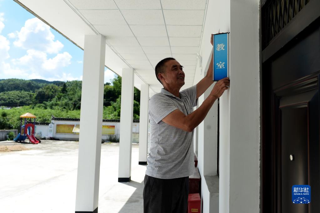 在菥荻教学点,许新民在悬挂教室标识牌(8月31日摄)。