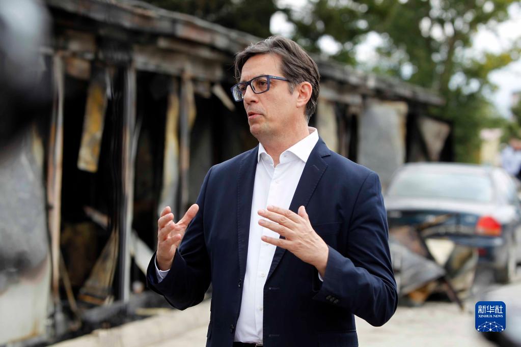 9月9日,北马其顿总统彭达罗夫斯基在泰托沃市的失火现场发表声明。