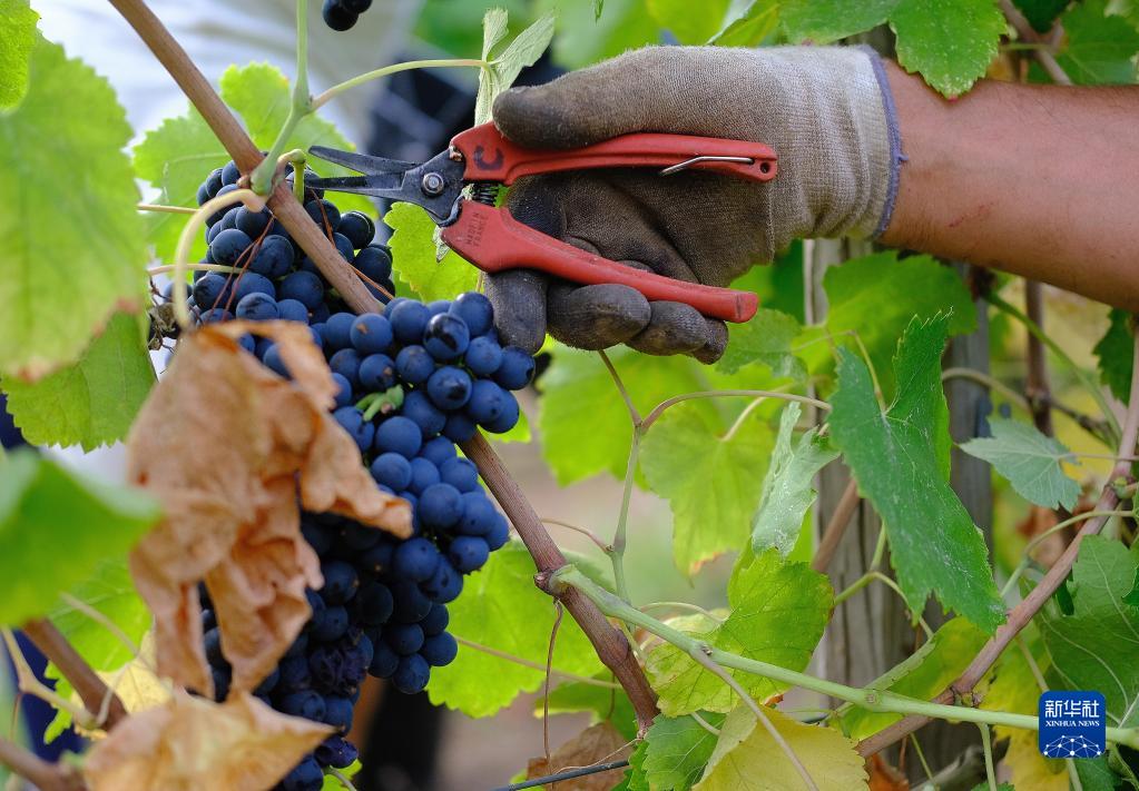 9月9日,在法国南部滨海阿尔卑斯省的芒德略拉纳普勒,果农采摘用来酿酒的葡萄。