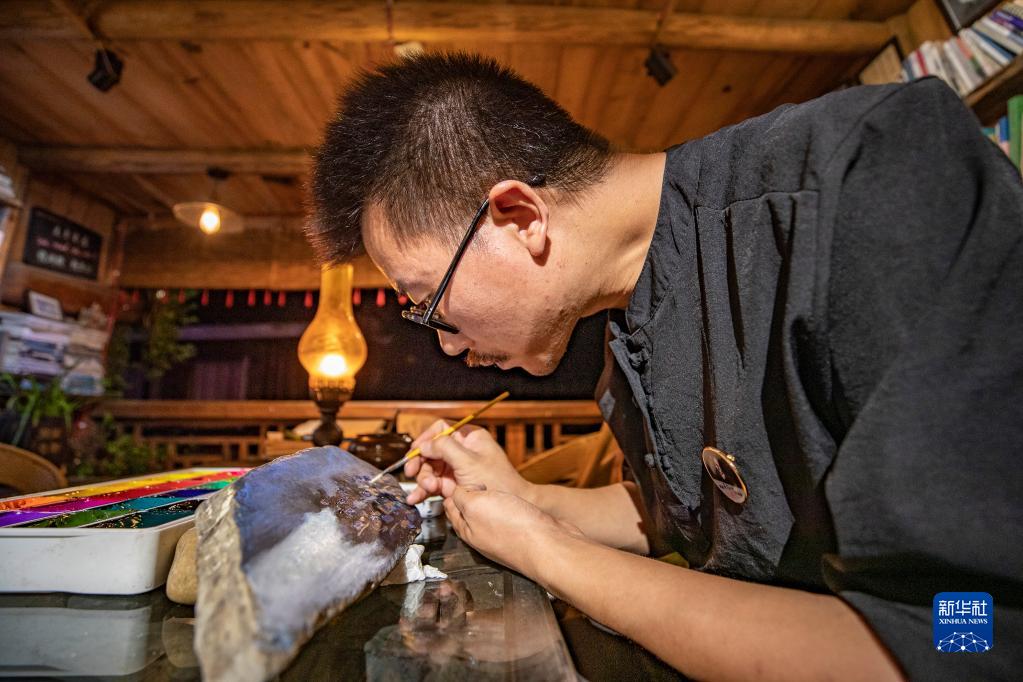 9月9日,在重庆酉阳龚滩古镇先生书屋,戚玉龙进行“龙画石”文创产品创作。