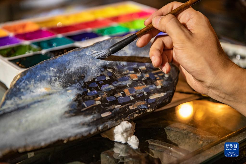 9月9日,在重庆酉阳龚滩古镇先生书屋,戚玉龙进行“龙画石”文创产品创作。