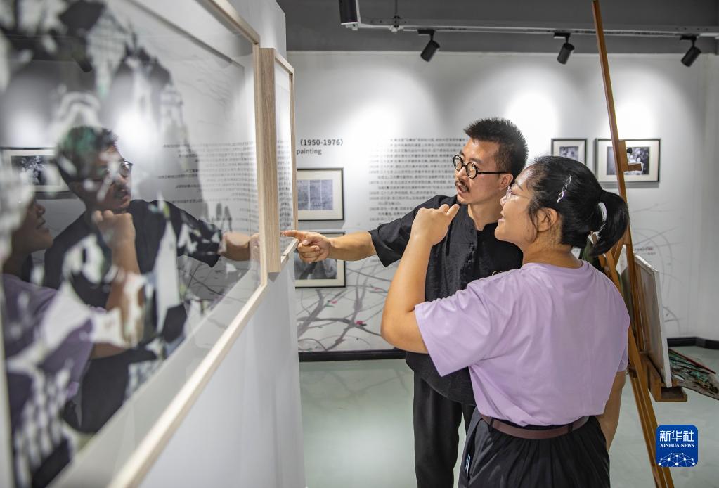 9月9日,在重庆酉阳龚滩古镇吴冠中纪念馆,被聘为纪念馆馆长的戚玉龙(后)为游客讲解吴冠中在龚滩的画作。