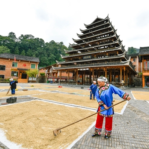 初秋时节,贵州省黔东南苗族侗族自治州镇远县报京侗寨的村民开始收割、晾晒稻谷。侗寨民居间一地金黄,与山间绿树相互映衬,一片收获景象。