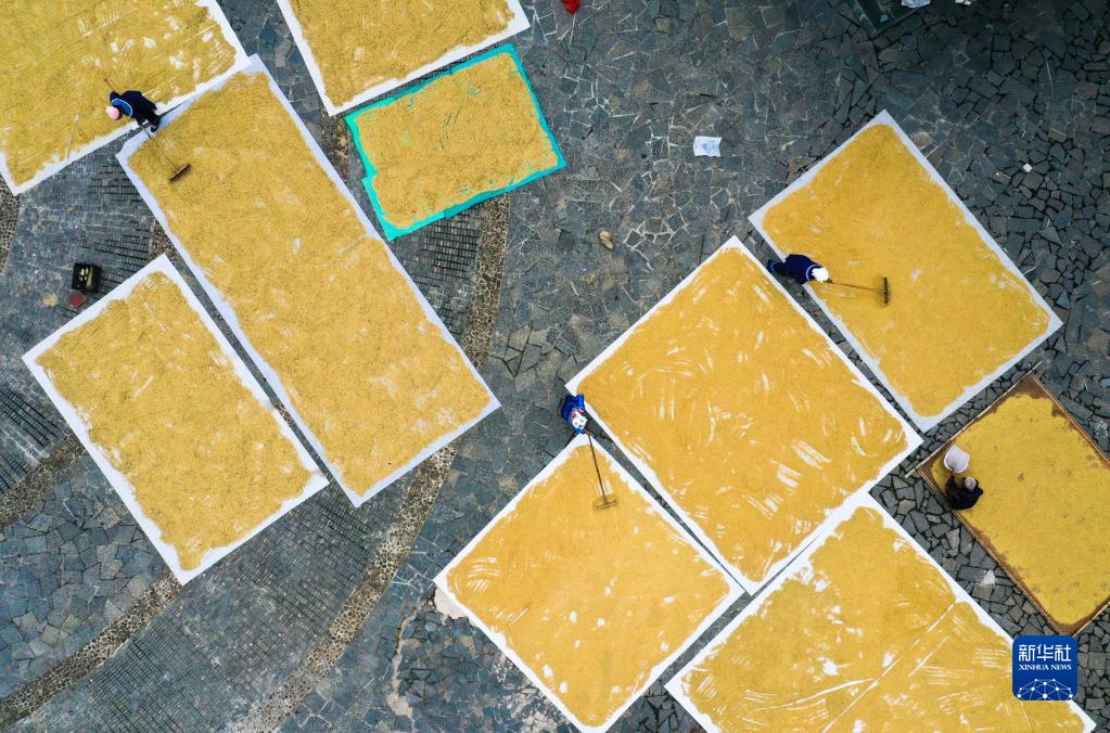 贵州省镇远县报京侗寨的村民在晾晒稻谷(9月8日摄,无人机照片)。