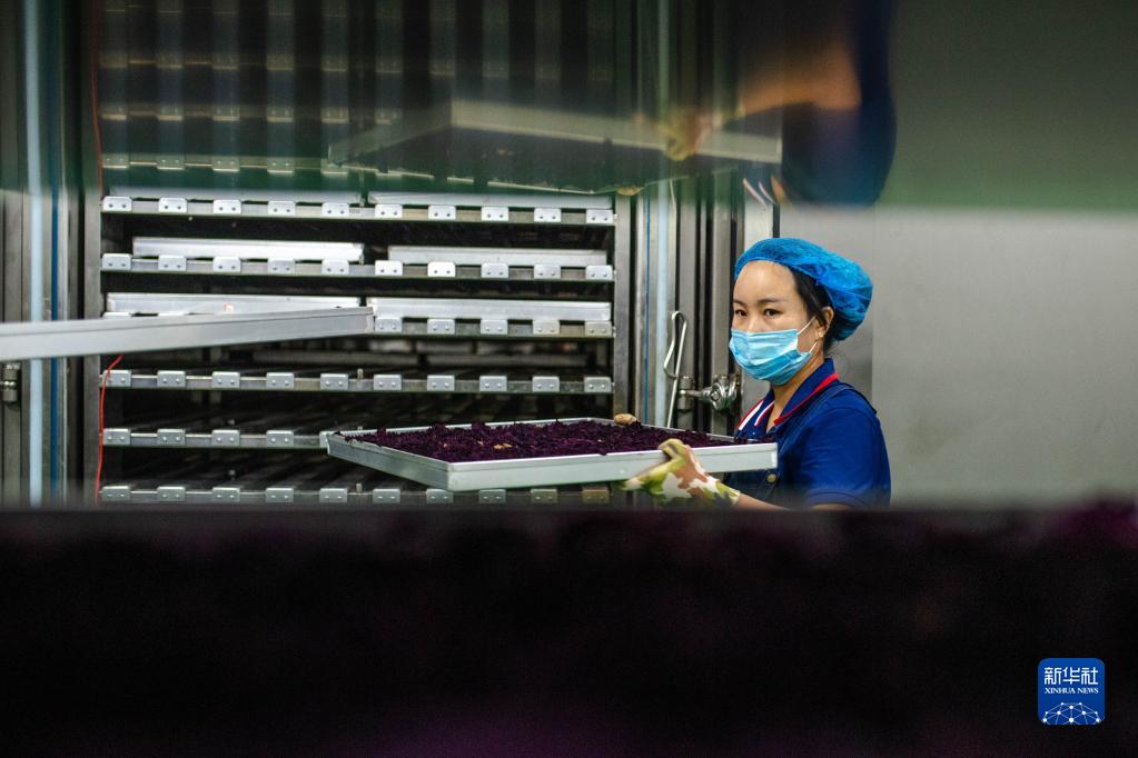 9月9日,在云南省弥勒市工业园区,云南花能量食品有限公司的工作人员在搬运冻干玫瑰花。