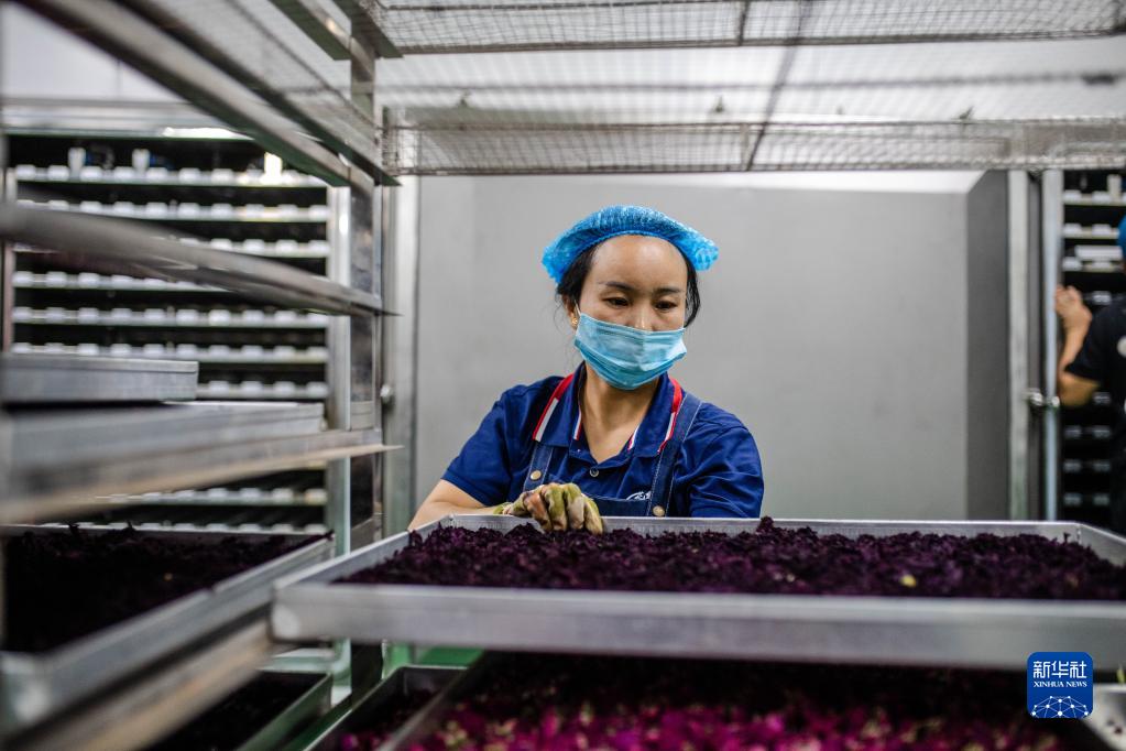9月9日,在云南省弥勒市工业园区,云南花能量食品有限公司的工作人员在搬运冻干玫瑰花。