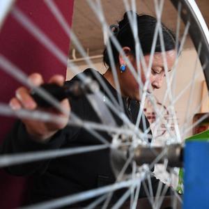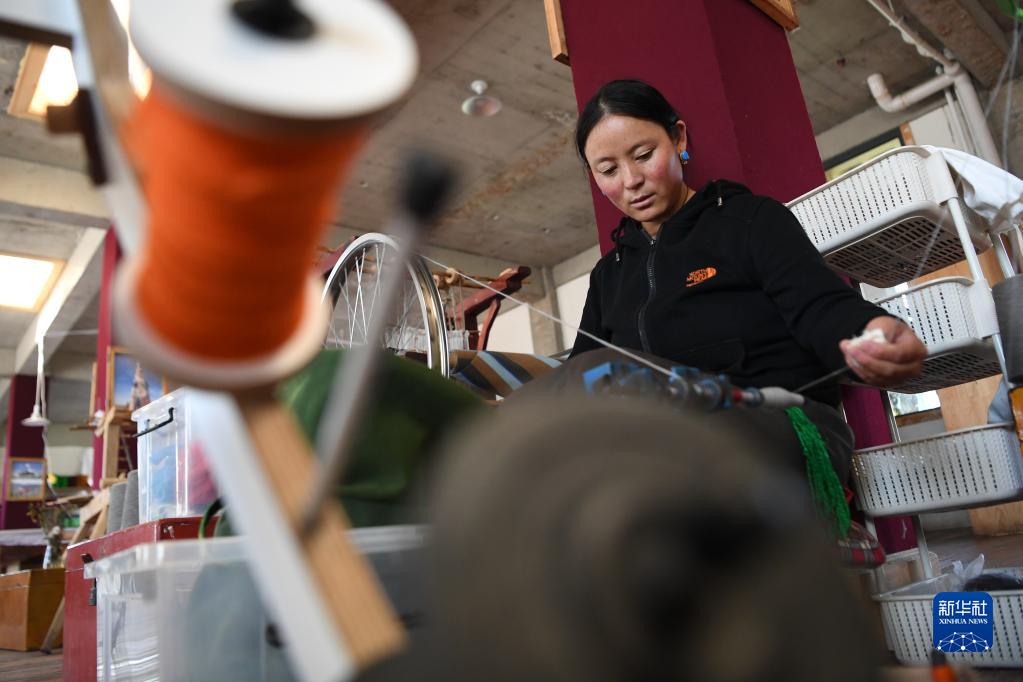 加科村村民旦真吉在藏族手工艺品车间里纺线(9月9日摄)。