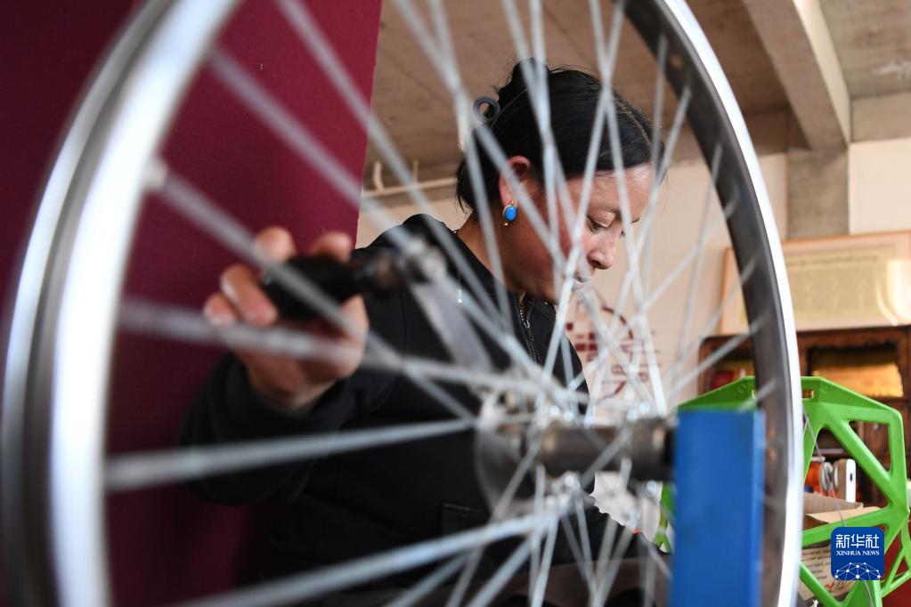 加科村村民旦真吉在藏族手工艺品车间纺线(9月9日摄)。