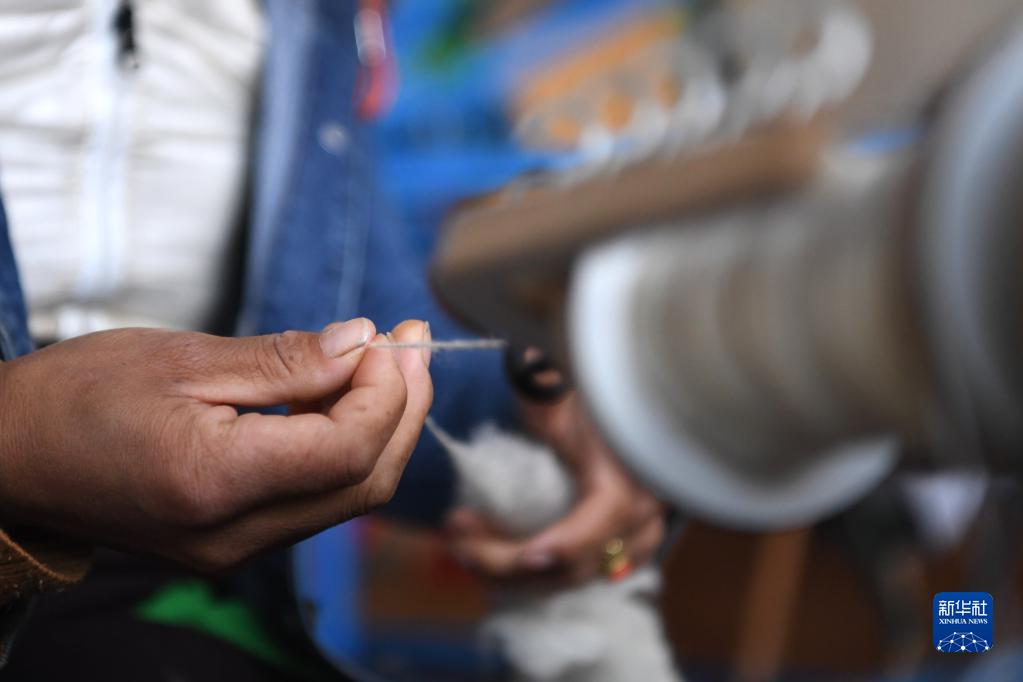 加科村村民拉周玛在藏族手工艺品车间里手工捻线(9月9日摄)。