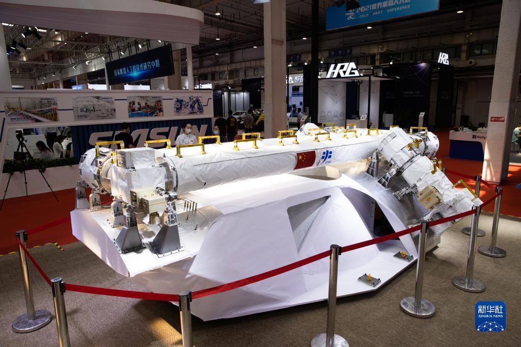 这是9月10日在2021世界机器人博览会现场拍摄的大型空间站机械臂。