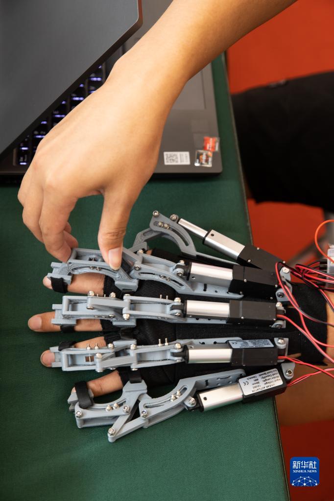 9月10日,一名工作人员在2021世界机器人博览会现场演示脑控机器人如何控制手部运动。