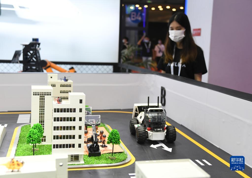 9月10日在2021世界机器人博览会现场拍摄的教育机器人,它可以用于智能网联汽车模拟教学。