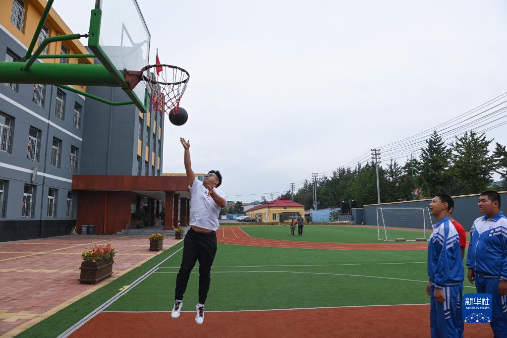 9月6日,凤城市特殊教育学校老师李化(左一)在体育课上为学生示范三步上篮动作。
