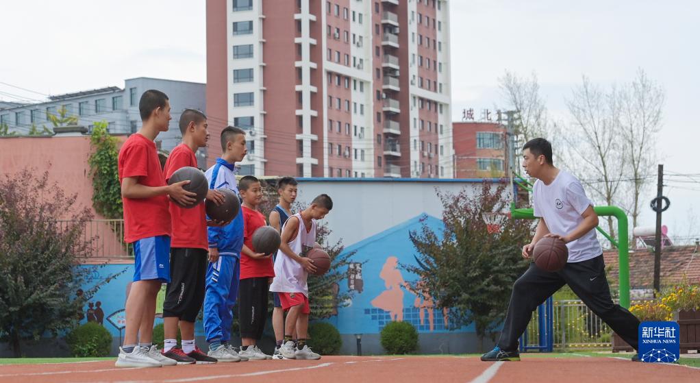 9月6日,凤城市特殊教育学校老师方向(右一)在体育课上教学生运球。