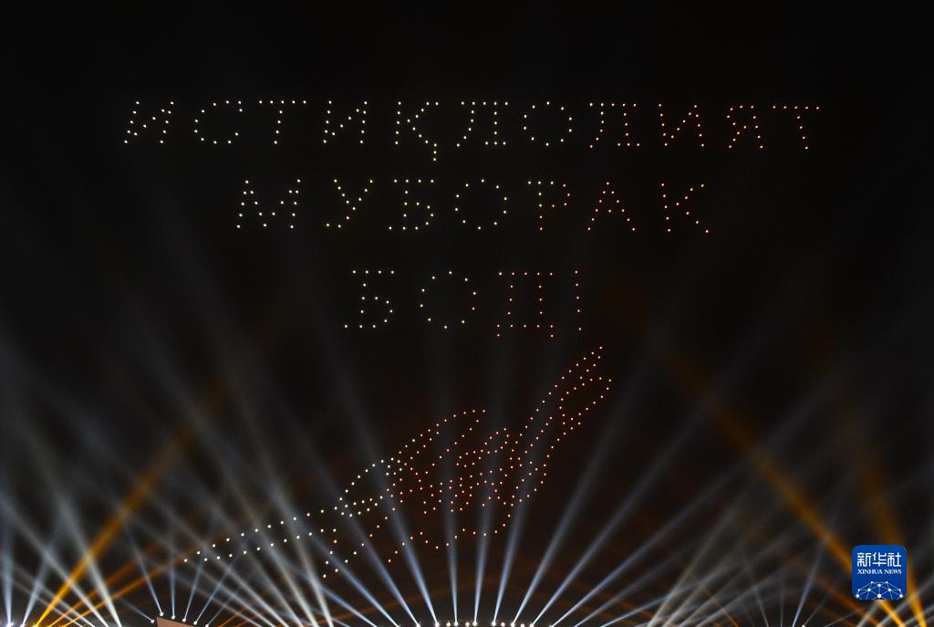 9月9日,在塔吉克斯坦首都杜尚别举行的庆祝晚会上,无人机拼出塔吉克语庆祝独立日字样。