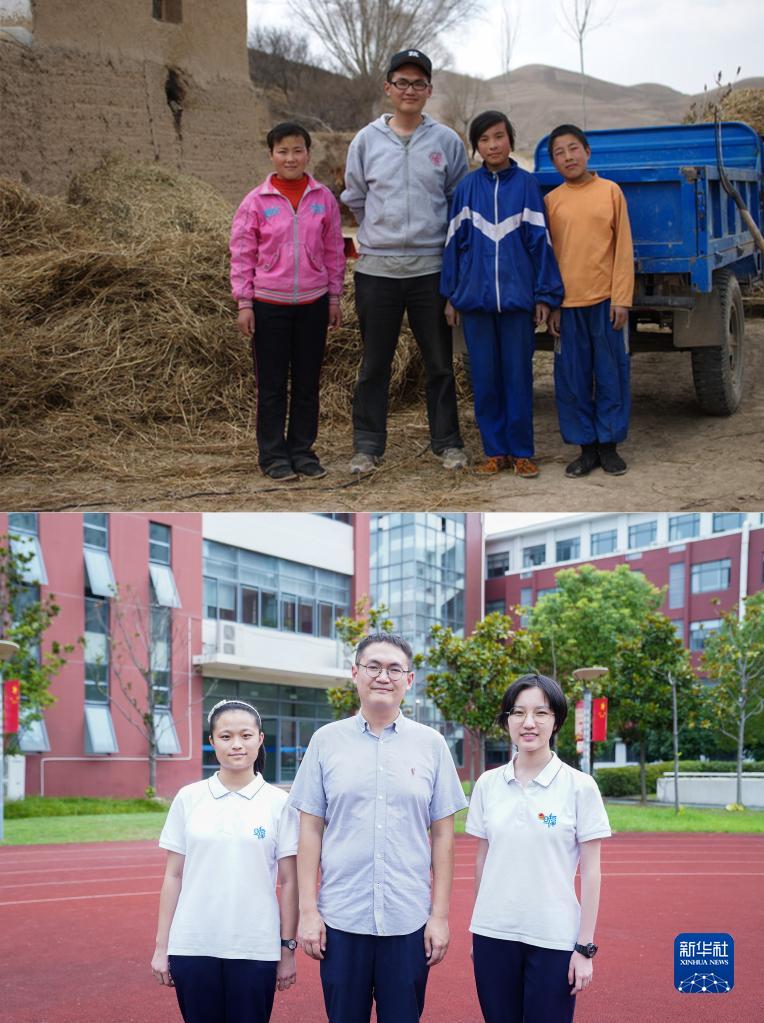 拼版照片:上图是第12届研支团队员于萌在西吉县王民乡与学生合影留念(受访者供图);下图是2021年9月8日,于萌在上海市浦东复旦附中分校内与学生合影(新华社记者 丁汀 摄)。