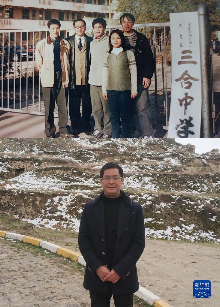 拼版照片:上图是第3届研支团队员黄加锐(右三)支教时在西吉县三合中学的校门前留影;下图是黄加锐的近照。