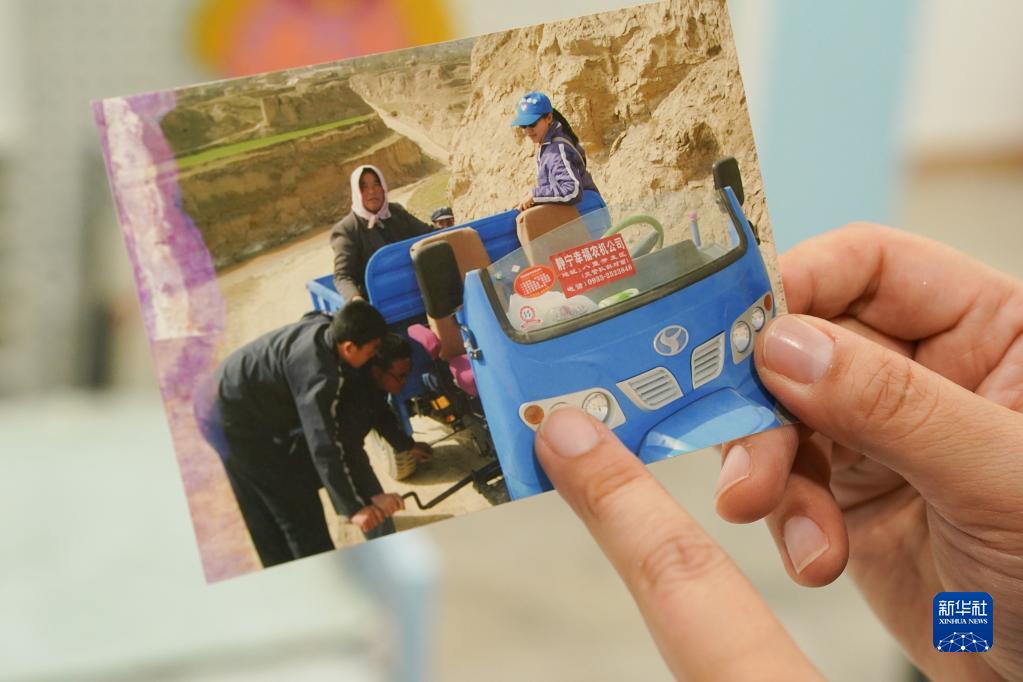 第7届研支团队员李冬茵边看照片边讲述当年支教期间家访的故事(9月8日摄)。