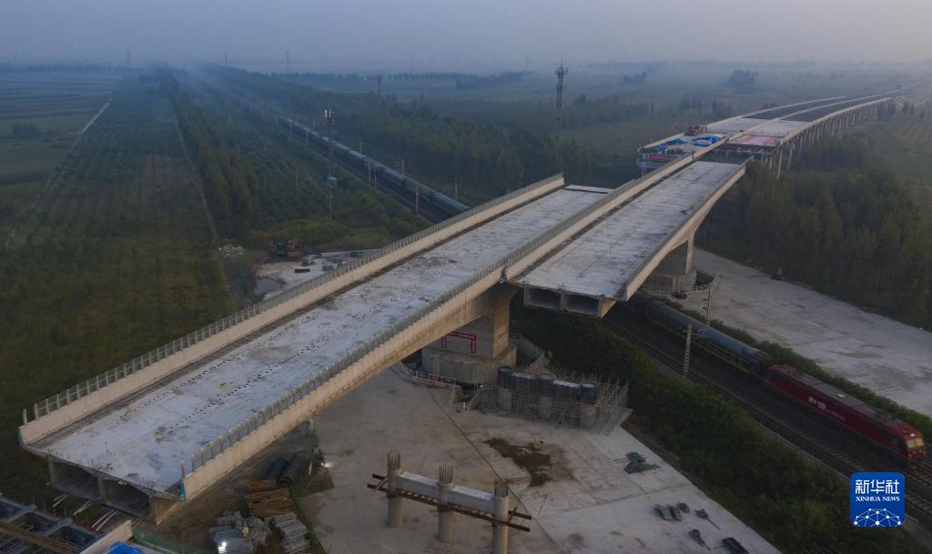 9月10日,滦州市境内的迁(安)曹(妃甸)高速公路跨京哈铁路桥转体成功(无人机照片)。