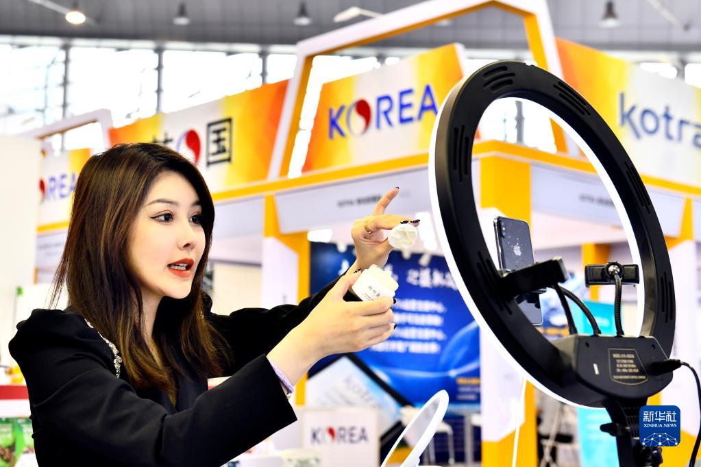 9月10日,在威海市国际展览中心,一名主播在韩国(山东)进口商品博览会现场直播带货。