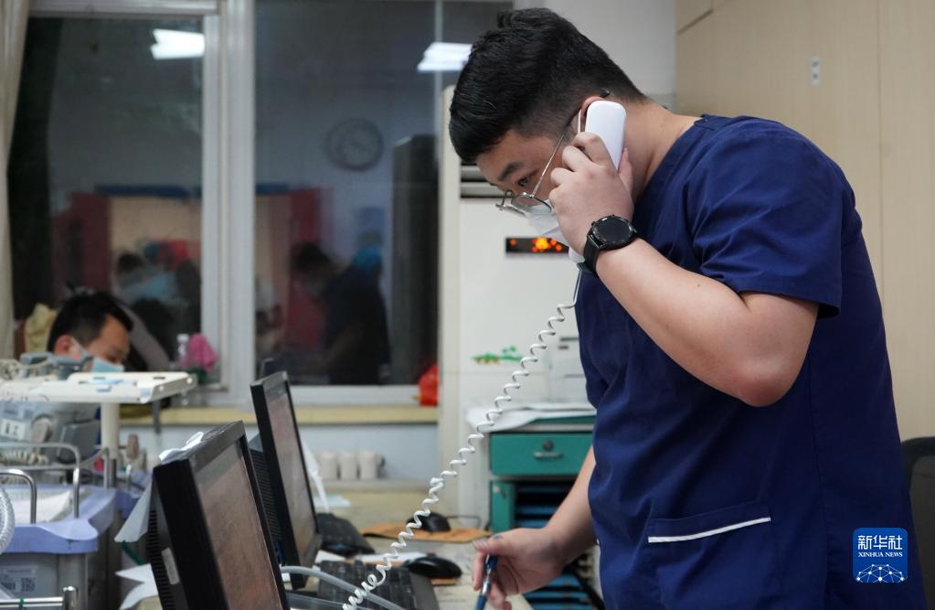 天津医科大学总医院急诊医生接听值班电话(9月8日摄)。