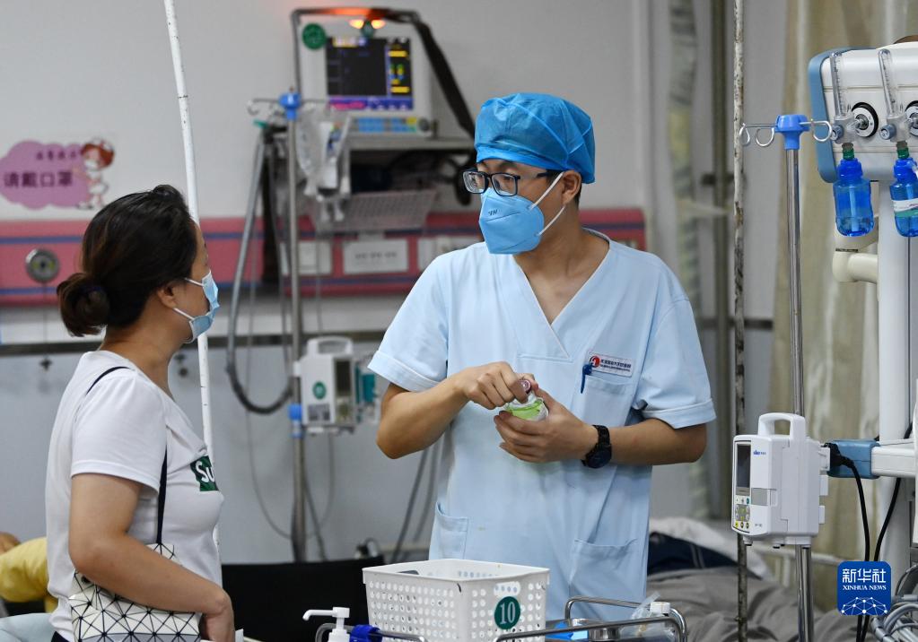 天津医科大学总医院急诊护士和患者家属交流(9月8日摄)。