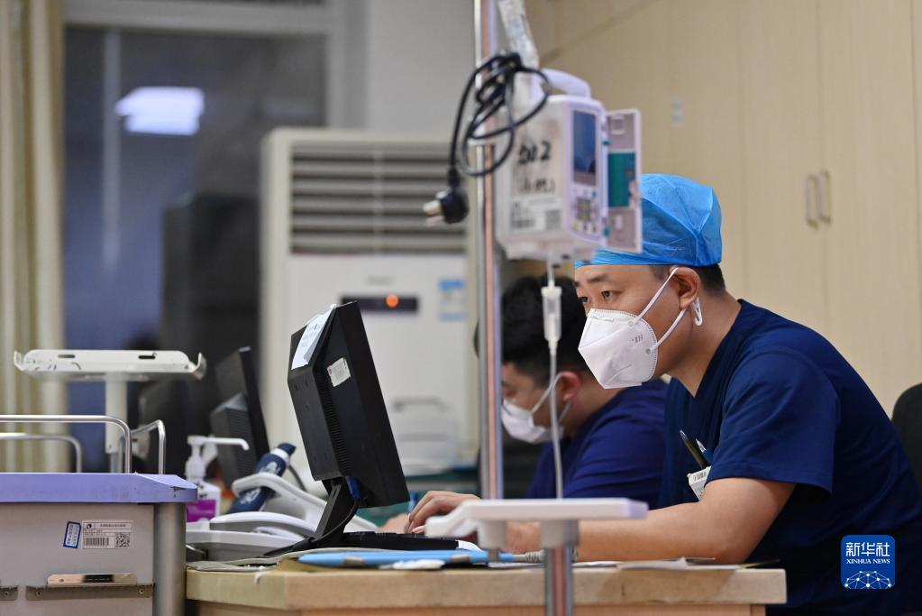 天津医科大学总医院急诊医生在电脑前工作(9月7日摄)。
