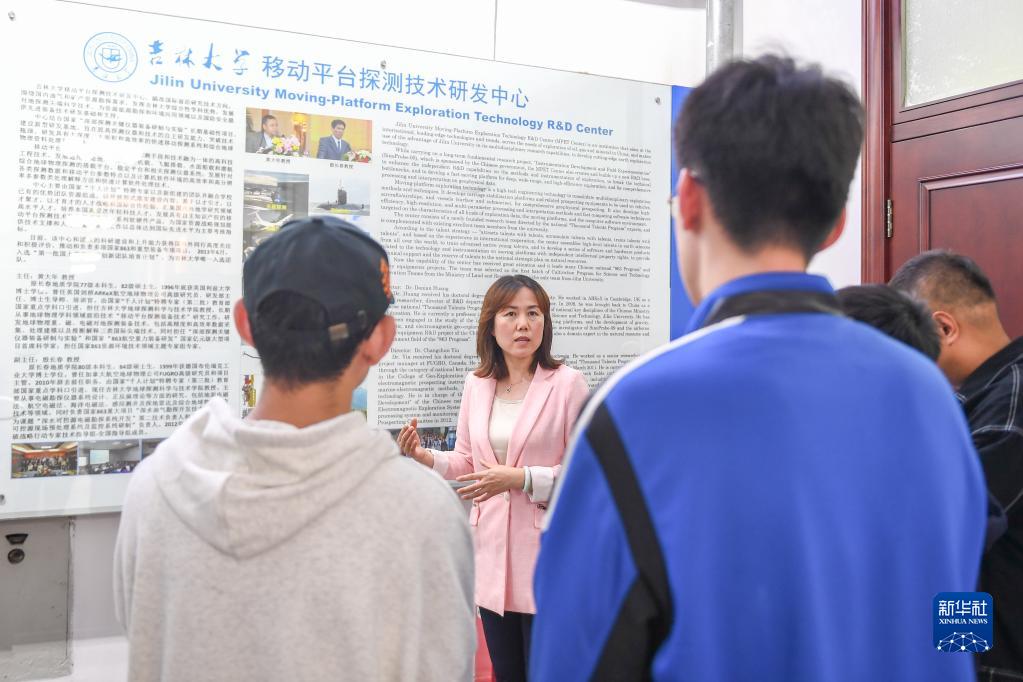 9月9日,在吉林大学地球探测科学与技术学院,黄大年式教师团队成员于平教授(左二)向学生介绍科研项目内容。