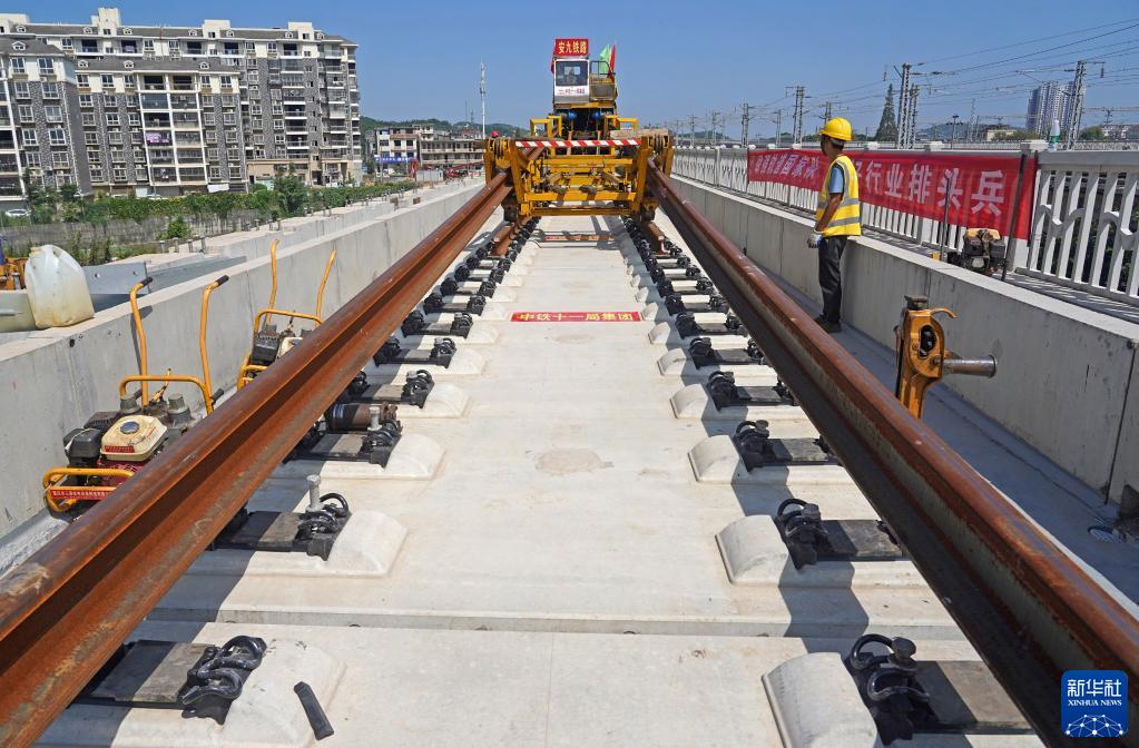 9月10日,在九江市庐山站北侧,中铁十一局的施工人员在进行铺轨作业。