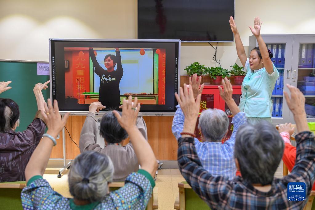 9月7日,在长春市“佐邻佑舍”南湖托老中心,护工带领老人做手指操。