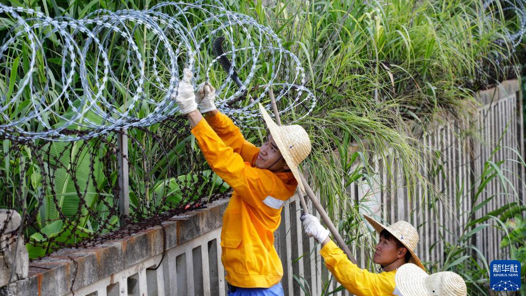 广西沿海铁路股份有限公司钦州工务段工人在对高铁防护栅栏刺丝滚笼进行加高作业(9月3日摄)。