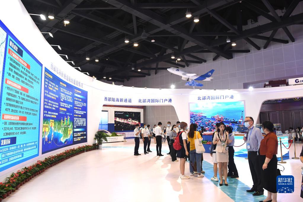 9月10日,工作人员在向参观者介绍西部陆海新通道建设情况。