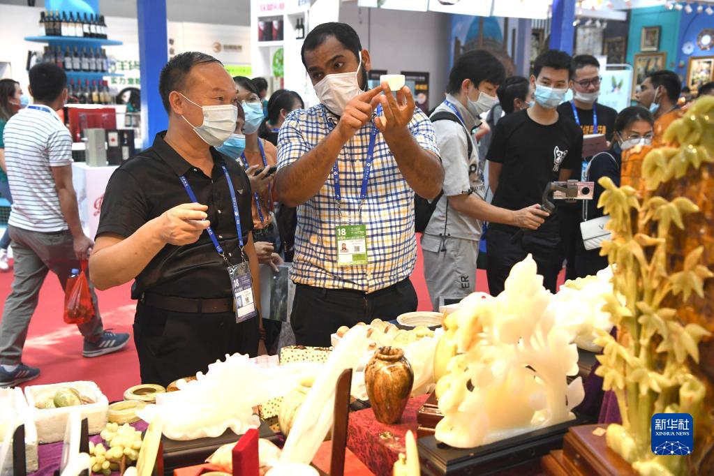 9月10日,工作人员在“一带一路”国际展区向参观者介绍玉器。