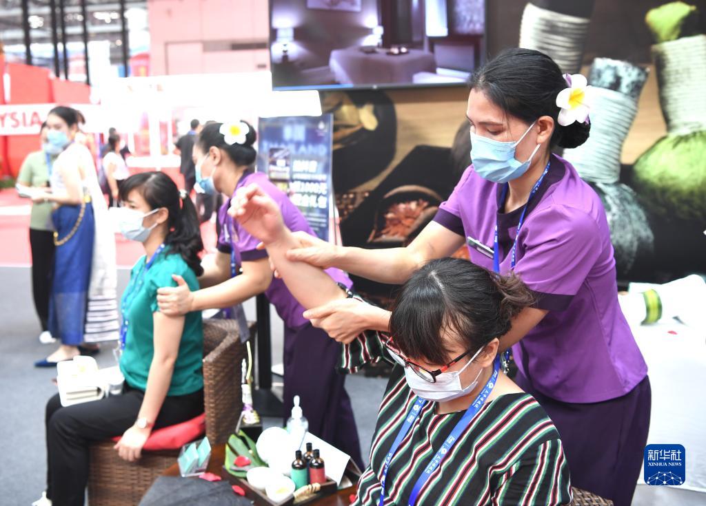 9月10日,参观者在东盟国家展区泰国馆体验泰式按摩。