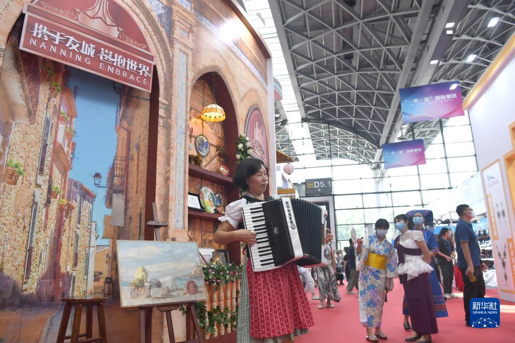 9月10日,工作人员在“一带一路”国际展区法国展台弹奏乐曲。