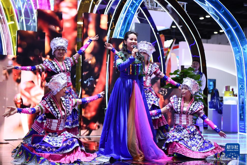 9月10日,演员在贵阳展台表演歌舞节目。