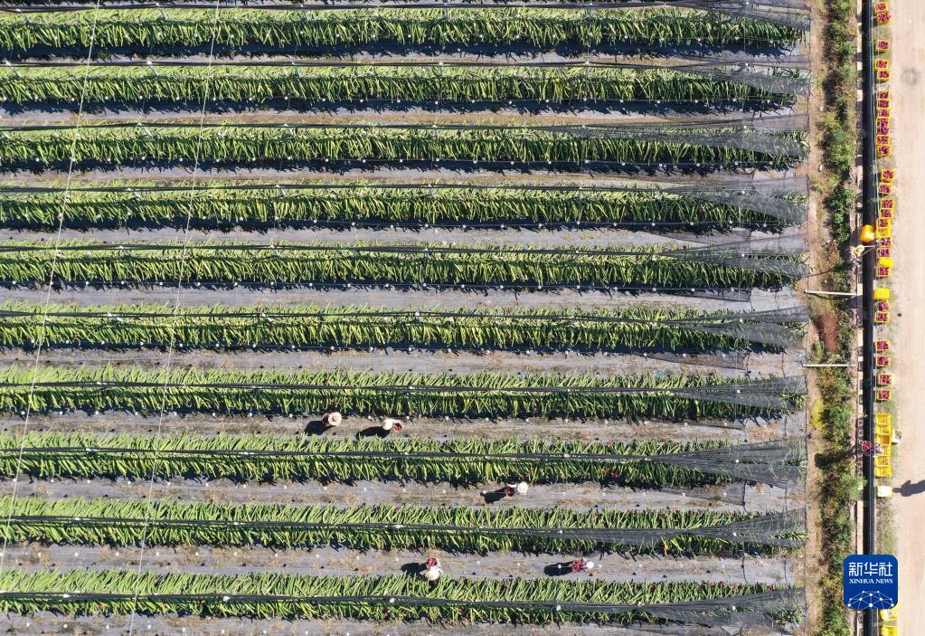 9月10日,景洪市勐罕镇的果农在采摘火龙果(无人机照片)。