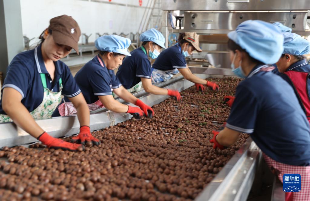 9月8日,景洪市一家坚果公司的工人在挑拣坚果。
