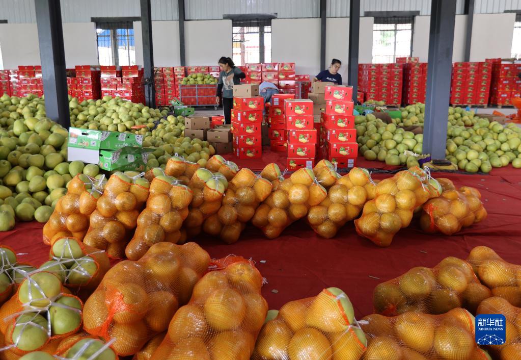 9月9日,景洪市勐罕镇的果农在包装柚子。