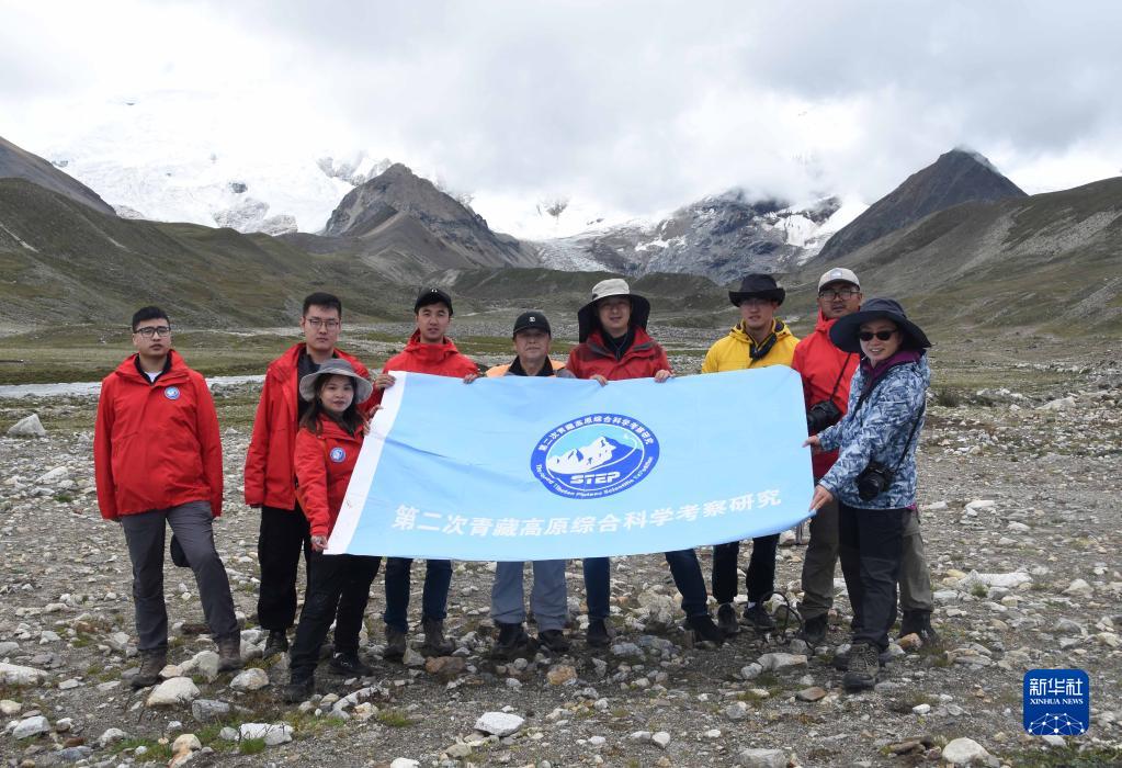 8月24日,在西藏日喀则市区域内的喜马拉雅山脉一处雪山下,中科院地理科学与资源研究所客座教授李渝生(中)和年轻队员们合影。