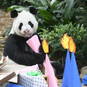 9月10日,大熊猫“凯凯”在新加坡河川生态园举行的生日会上玩耍。