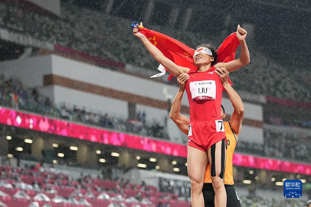 9月4日,刘翠青(上)和领跑员徐冬林在比赛后庆祝。当日,在东京残奥会田径女子200米T11级决赛中,中国选手刘翠青获得金牌。新华社记者 熊琦 摄