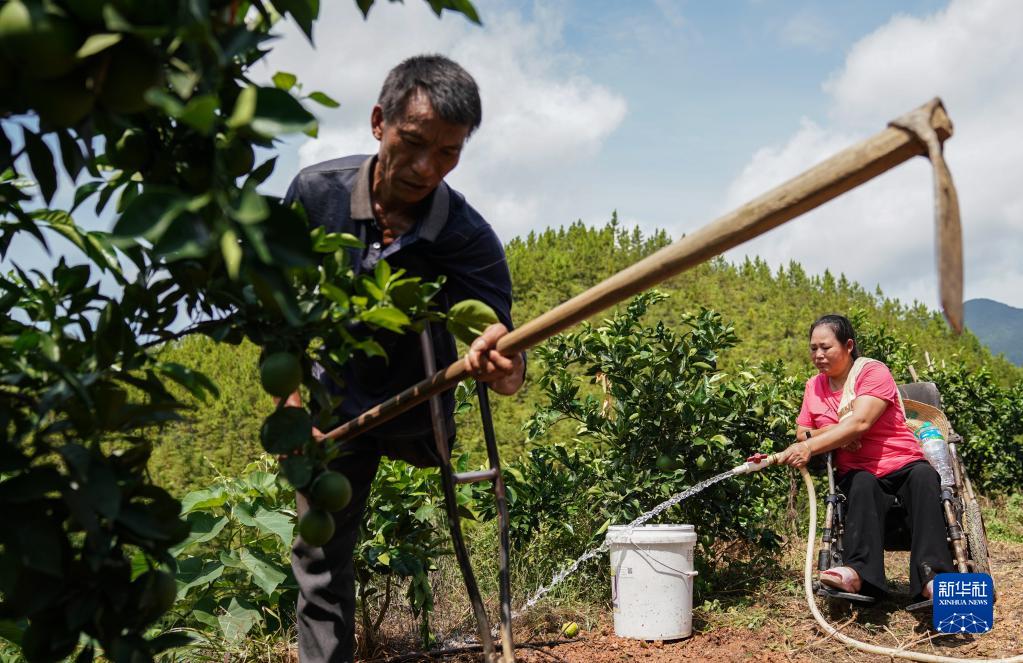 8月11日,残疾人夫妇袁长明、刘招娣在位于江西省信丰县大桥镇的脐橙园劳作。夫妇俩在当地政府的帮扶下种植水稻、花生、脐橙、玉米等农作物。2019年,袁长明一家脱贫摘帽。新华社记者 胡晨欢 摄