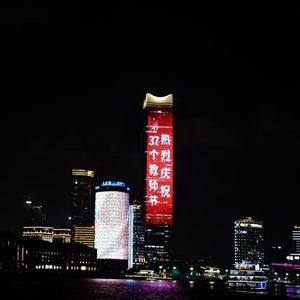 当日是我国第37个教师节,上海外滩上演“灯光秀”点亮祝福语,向广大教师致敬。新华社记者 张建松 摄