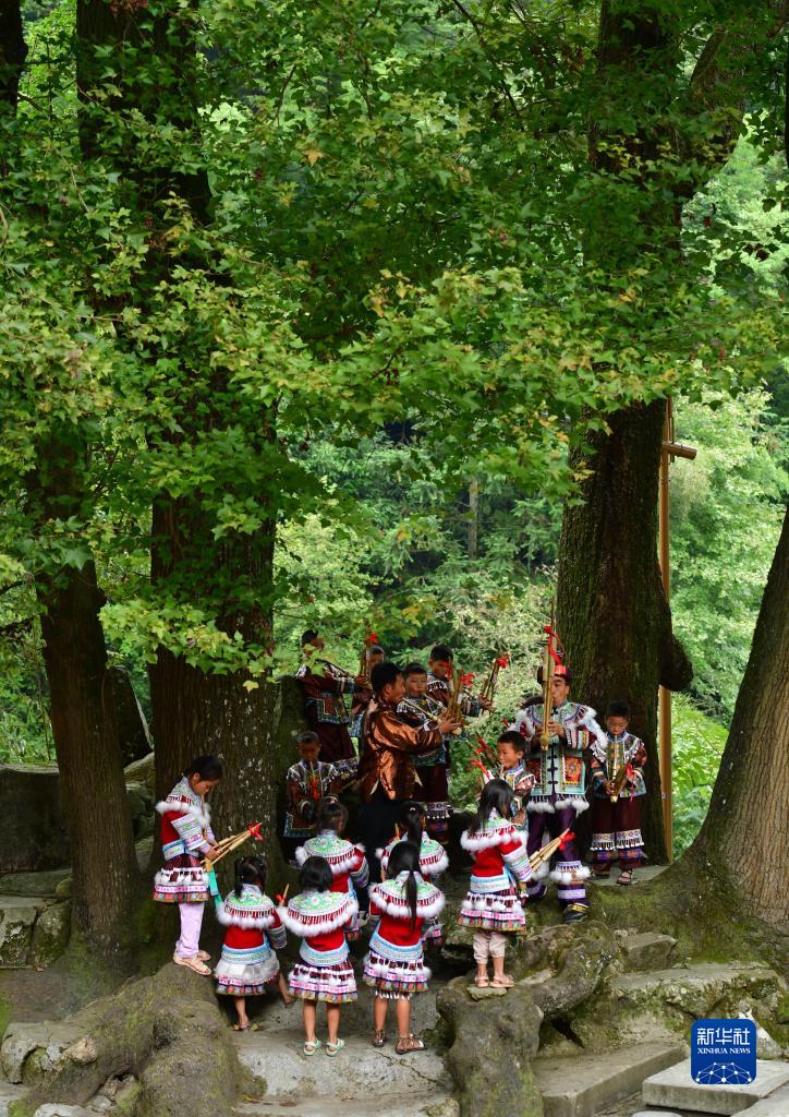 在桂黔交界乌英苗寨教学点“芦笙文化进校园”课堂上,师生们在吹芦笙(9月1日摄)。