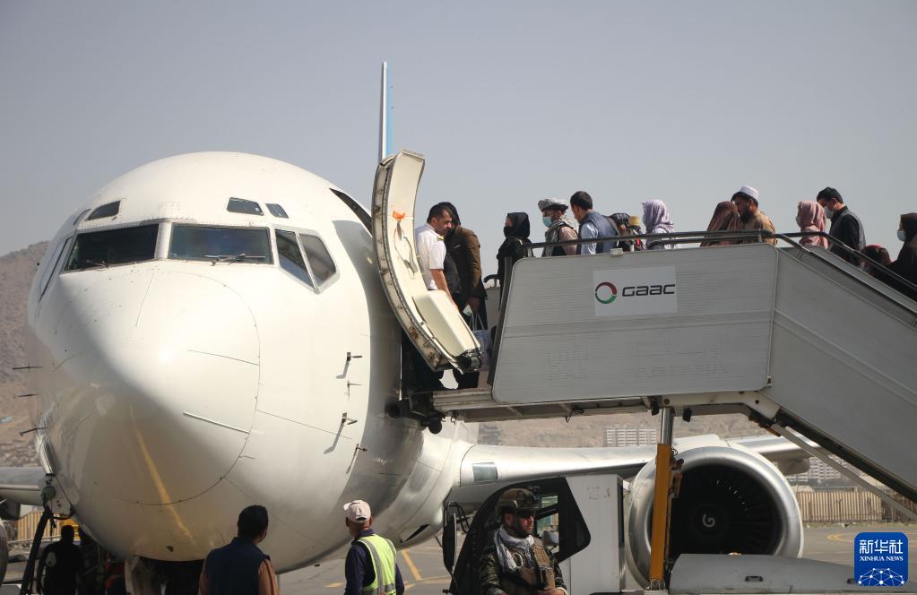 9月6日,人们在阿富汗喀布尔国际机场乘坐阿里亚纳航空公司的航班。