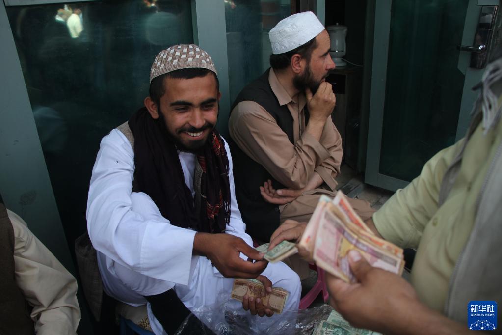 9月4日,阿富汗人在喀布尔一家货币交易市场内兑换货币。