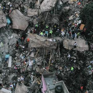9月10日,救援人员在墨西哥特拉尔内潘特拉发生山体滑坡的现场救援(无人机照片)。
