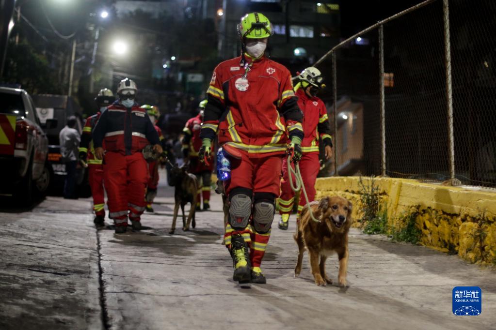 9月10日,救援人员带着搜救犬抵达墨西哥特拉尔内潘特拉发生山体滑坡的现场。