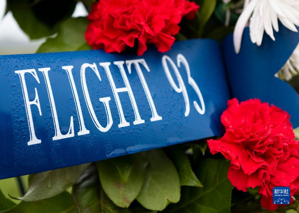 9月9日,在美国宾夕法尼亚州尚克斯维尔的93号航班国家纪念园,一个花环上标记着“93号航班”字样。